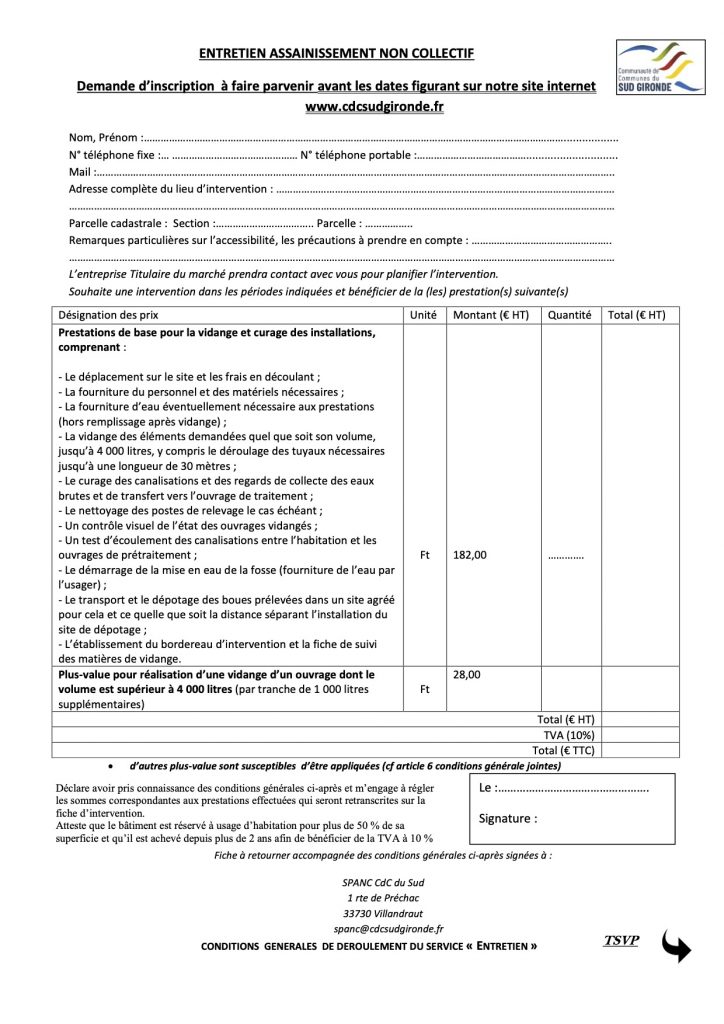 Pour en bénéficier, il leur suffit de s’inscrire auprès de notre service SPANC via la fiche jointe ici jointe.